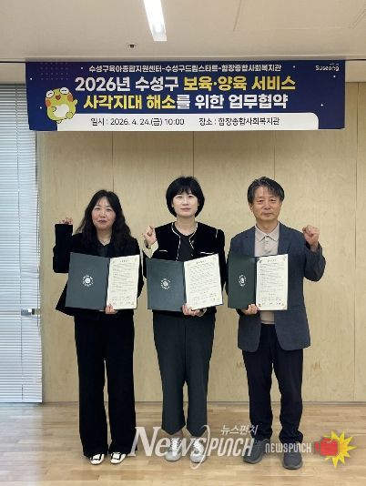 뉴스펀치 조평훈 기자 | 대구 수성구육아종합지원센터(센터장 심영숙)는 지난 24일 수성구 드림스타트센터(센터장 김은미), 함장종합사회복지관(관장 권혁철)과 지역 내 보육·양육 서비스 사각지대 해소를 위한 ‘3자 업무협약(MOU)’을 체결했다고 밝혔다.