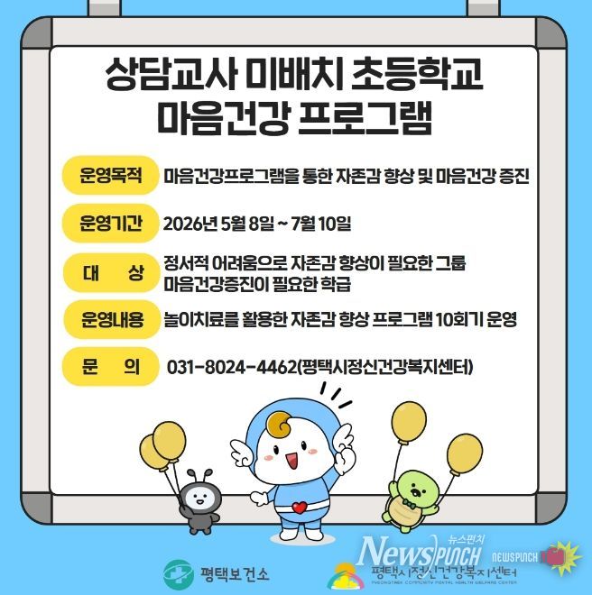뉴스펀치 박상훈 기자 | 평택시는 상담교사가 배치되지 않은 초등학교 학생들의 정신건강 지원을 위해 ‘마음건강 프로그램’을 운영한다고 밝혔다.
