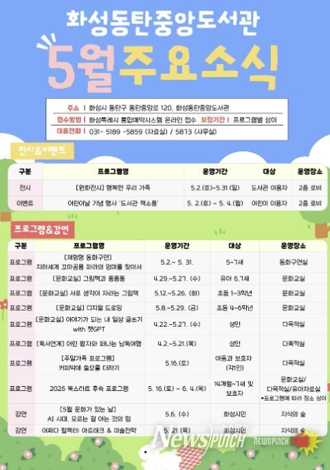 뉴스펀치 박상훈 기자 | 화성동탄중앙도서관이 어린이날과 가정의 달을 맞아 5월 한 달간 도서관 이용자와 시민을 대상으로 자료실과 3층 공공의 마당 등에서 다양한 문화행사를 운영한다.