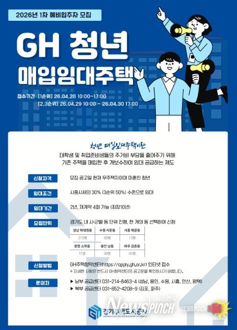 뉴스펀치 박상훈 기자 | 경기주택도시공사(GH)가 청년층 주거 부담을 덜고 안정적인 생활 기반을 마련할 수 있도록 청년 및 자립준비 청년을 위한 매입임대주택 예비입주자 396명을 모집한다고 27일 밝혔다.