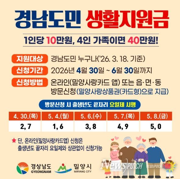 뉴스펀치 박세훈 기자 | 경남 밀양시는 오는 4월 30일부터 시민 생활 안정을 지원하기 위한 ‘경남도민 생활지원금’ 신청을 받는다고 밝혔다.