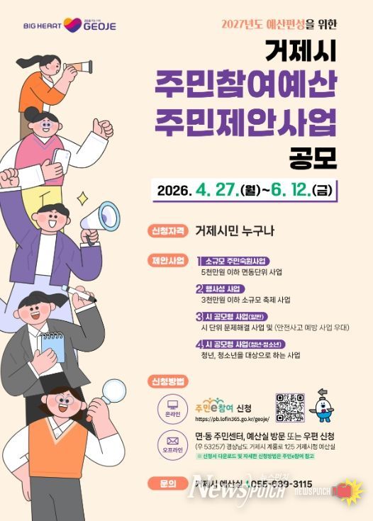 뉴스펀치 박세훈 기자 | 거제시는 2027년도 본예산 편성을 앞두고 재정운용의 투명성과 시민에게 공감받는 예산편성을 실현하고자 오는 6월 12일까지‘주민참여예산 제안사업 공모’를 실시한다.