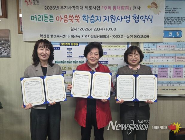 뉴스펀치 김윤걸 기자 | 부산 동래구 복산동 행정복지센터는 지난 23일 복산동지역사회보장협의체, (주)대교눈높이 부산동래교육국과 ‘머리튼튼 마음쑥쑥' 학습지 지원사업 추진을 위한 협약을 체결했다고 밝혔다.