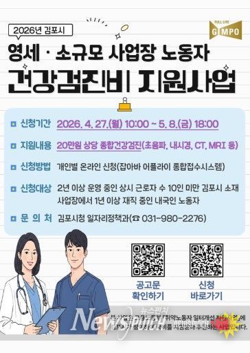 뉴스펀치 박상훈 기자 | 김포시는 영세·소규모 사업장 노동자의 건강권 보장과 안전한 근로환경 조성을 위해 '2026년 영세·소규모 사업장 노동자 건강검진비 지원사업' 참여자를 모집한다.