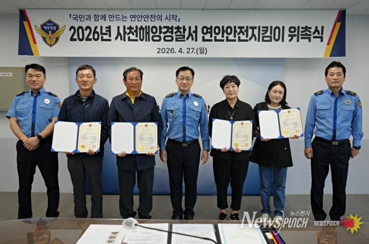 뉴스펀치 박세훈 기자 | 사천해양경찰서는 27일 연안사고 예방을 위해 선발된 ‘26년도 연안안전지킴이” 4명을 위촉했다고 밝혔다.