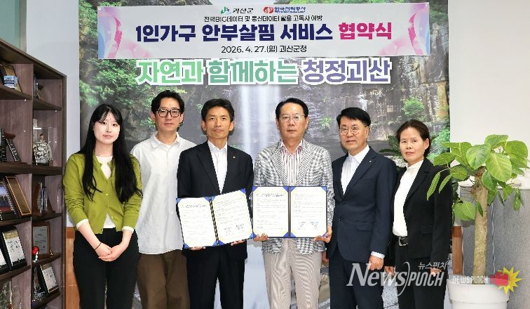 뉴스펀치 이현승 기자 | 충북 괴산군은 군청 집무실에서 한국전력공사증평괴산지사와 1인가구 안부살핌 서비스 업무협약(MOU)을 체결했다고 27일 밝혔다.