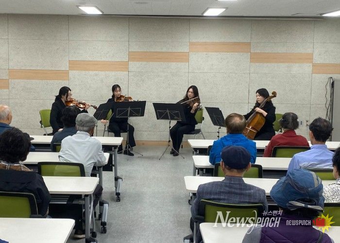 이날 공연에는 부산시립예술단 청소년교향악단 단원 4명(바이올린, 비올라, 첼로)이 참여해 ‘사랑의 인사’, ‘베토벤 바이러스’, ‘어머나’, ‘붉은 노을’ 등 다양한 곡을 현악 앙상블로 선보였다. 특히 익숙한 멜로디를 중심으로 구성된 프로그램은 어르신들의 높은 호응과 적극적인 참여를 이끌어냈다.