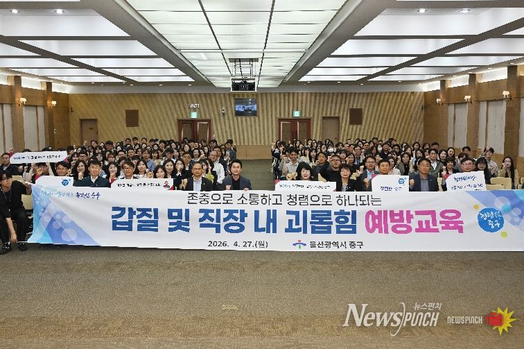 뉴스펀치 김윤걸 기자 | 울산 중구가 4월 27일 오후 2시 중구청 대회의실에서 직원들을 대상으로 ‘2026년 갑질 및 직장 내 괴롭힘 예방교육’을 실시했다.
