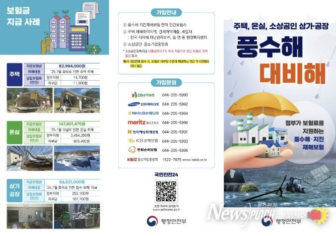 보험가입 대상은 △주택(단독·공동, 세입자 가입 가능) △농·임업용 온실(비닐하우스 포함) △소상공인(상가, 공장) 등이며, 가입은 7개 민간보험사(DB손해보험, 삼성화재보험, NH농협손해보험, 메리츠화재, 현대해상화재보험, KB손해보험, 한화손해보험)에서 가능하다.