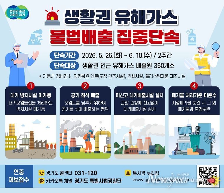 뉴스펀치 박상훈 기자 | 경기도 특별사법경찰단이 5월 26일부터 6월 10일까지 2주간 주거지·학교·병원 등 생활권 인근 지역의 유해가스 배출 사업장을 대상으로 불법행위를 집중단속 한다.