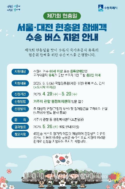뉴스펀치 박상훈 기자 | 수원특례시가 제71회 현충일인 6월 6일, 국립현충원(서울·대전)까지 이동이 여의치 않은 국가유공자 유족을 위해 현충원 왕복 수송버스를 운행한다.