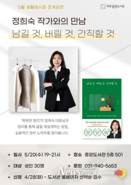 뉴스펀치 박상훈 기자 | 파주시 중앙도서관은 오는 5월 20일 19시, 정리 전문가 정희숙 작가를 초청한 '남길 것, 버릴 것, 간직할 것' 강연을 개최한다.