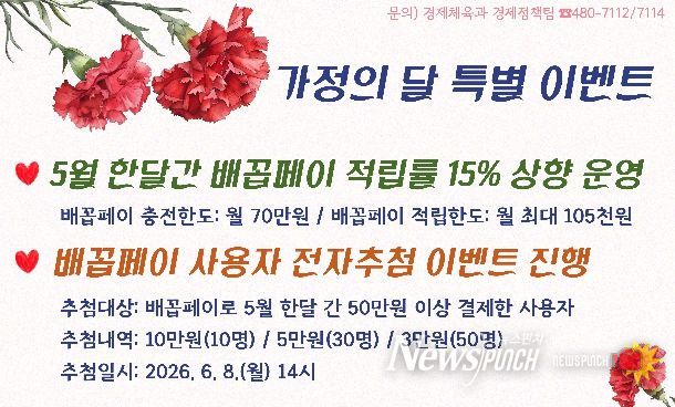 이미숙 경제체육과장은 “가정의 달을 맞아 추진하는 이번 특별이벤트가 지역 내 소비를 촉진하고, 소상공인과 자영업자의 매출 증대는 물론 지역경제 활성화에도 기여할 것으로 기대한다”고 말했다.