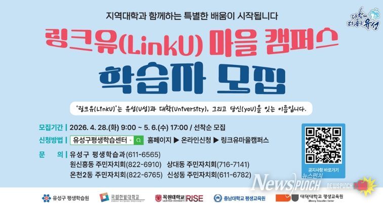 뉴스펀치 이현승 기자 | 대전 유성구는 5월부터 지역대학과 연계한 주민 밀착형 평생학습 ‘링크유(LinkU) 마을캠퍼스’ 상반기 프로그램을 운영한다.