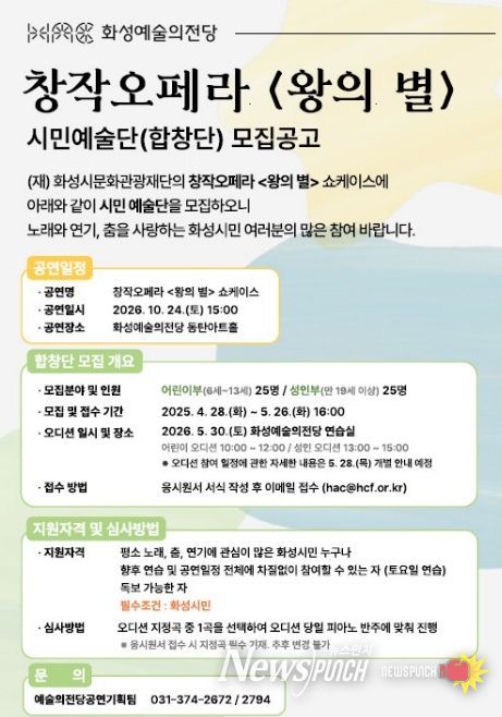 뉴스펀치 박상훈 기자 | (재)화성시문화관광재단은 오는 10월 개최 예정인 창작오페라 '왕의 별' 쇼케이스 무대에 참여할 시민합창단을 모집한다.