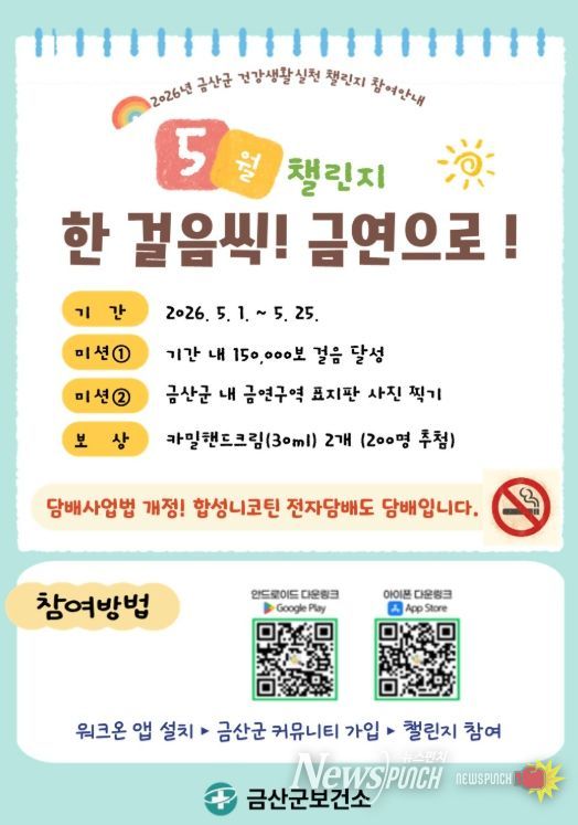 뉴스펀치 이현승 기자 | 금산군보건소는 지역주민의 건강증진과 금연 실천 분위기 확산을 위해 오는 2026 건강생활실천 5월 챌린지 ‘한 걸음씩! 금연으로!’를 5월 1일부터 25일까지 진행한다.