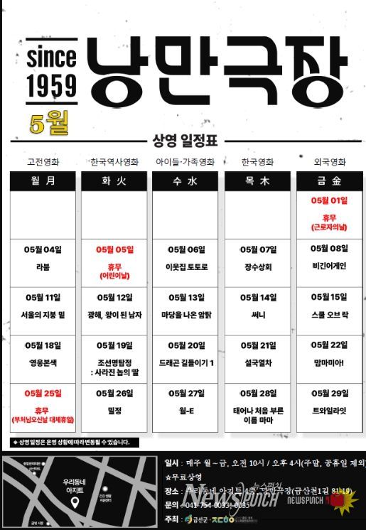 뉴스펀치 이현승 기자 | 금산군은 도시재생사업으로 조성된 우리동네아지트 4층 낭만극장에서 진행하는 5월 무료영화 상영을 안내했다.