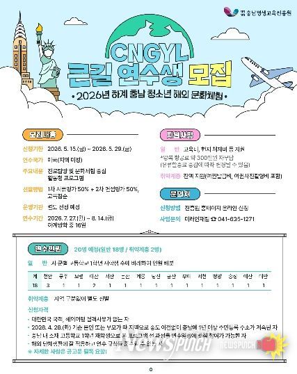 뉴스펀치 이현승 기자 | (재)충남평생교육진흥원은 도내 청소년들이 미국 현지에서 다양한 문화를 체험하고 자신의 진로를 탐색할 수 있도록'2026년 충남 청소년 해외 문화체험 큰길(CNGYL) 프로그램'하계 연수생을 모집한다.