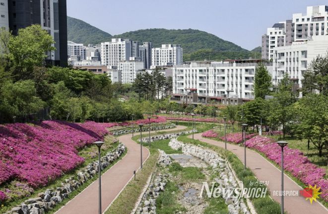 뉴스펀치 박상훈 기자 | 의왕시 백운밸리 지역의 생태 소하천 ‘바라천’이 봄을 맞아 화사한 철쭉(자산홍)으로 물들었다. 총길이 약 1km에 이르는 이 산책로에는 분홍빛 철쭉이 줄지어 피어나며 방문객들에게 아름다운 풍경을 선사하고 있다.