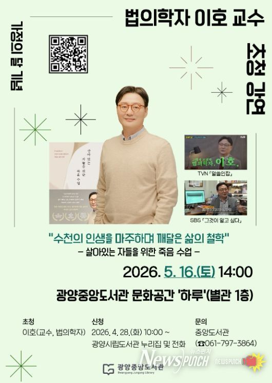 뉴스펀치 김용희 기자 | 광양중앙도서관은 5월 가정의 달을 맞아 오는 5월 16일 오후 2시 중앙도서관 문화공간 ‘하루’에서 법의학자 이호 교수를 초청해 인문학 강연을 운영한다고 밝혔다.