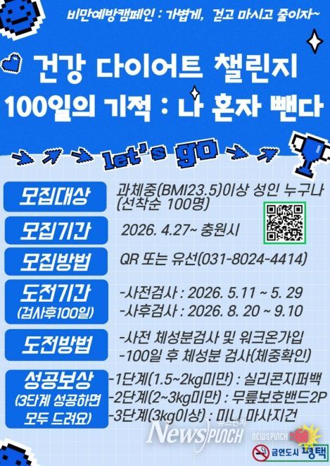 뉴스펀치 박상훈 기자 | 평택시는 시민들이 스스로 비만 관리 능력을 키우고 건강한 생활 습관을 정착시킬 수 있도록 돕는 비만 예방 프로그램 '100일의 기적’참가자를 모집한다고 밝혔다.