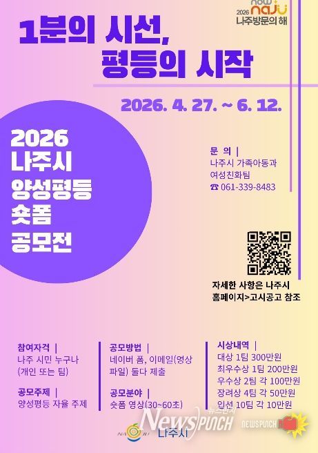 뉴스펀치 김용희 기자 | 전남 나주시가 양성평등 문화 확산을 위해 시민이 직접 참여하는 숏폼 영상 공모전을 개최하고 일상 속 평등 가치 확산에 나선다.