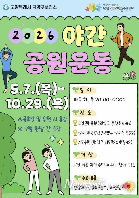 뉴스펀치 박상훈 기자 | 고양특례시 덕양구보건소는 오는 5월 7일부터 야간공원 운동교실을 운영한다.