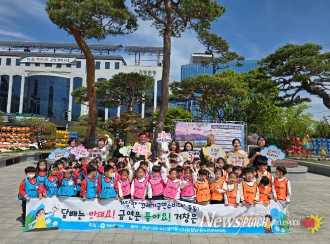 뉴스펀치 박세훈 기자 | 거창군 보건소는 28일 거창로타리에서 강남·나라·신나는강남어린이집 3개소 원아 60여 명이 참여해 ‘담배는 안돼요’를 주 슬로건으로 금연 캠페인을 펼쳤다.