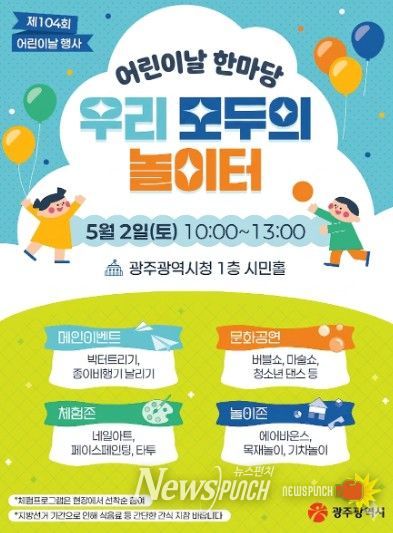 뉴스펀치 김용희 기자 | 광주광역시는 어린이날을 기념해 오는 5월 2일 오전 10시부터 오후 1시까지 시청 1층 시민홀에서 특별행사를 연다.