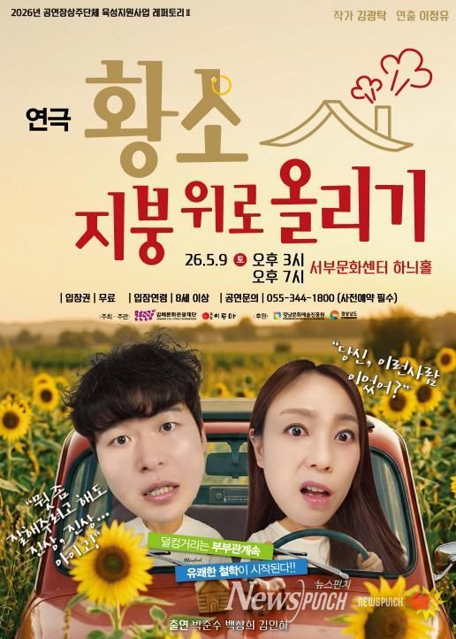 뉴스펀치 박세훈 기자 | (재)김해문화관광재단 김해서부문화센터는 경남문화예술진흥원이 주관하는 ‘2026 공연장상주단체 육성지원사업’에 선정되어, 오는 5월 9일 두 번째 레퍼토리 공연 연극 '황소, 지붕위로 올리기'를 선보인다.