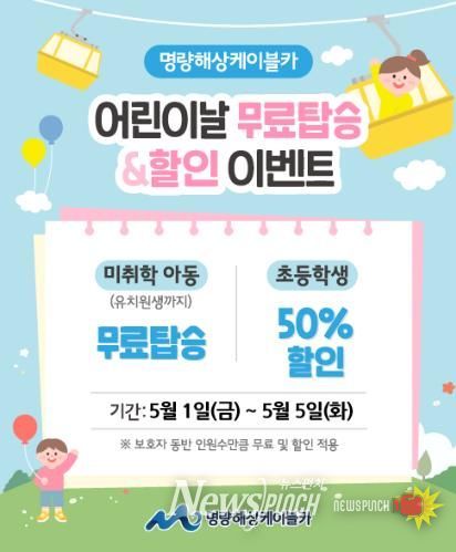 특히 전남 해남과 진도에 아이들이 좋아할만한 5월 축제들과 다양한 관광지가 있어 가족단위 관광객들에게 관심이 모아지고 있는데, 명량해상케이블카에서는 5월 1일부터 5일까지 5일간, 어린이 관광객들을 위한 깜짝 선물을 준비했는데, 기간동안 명량해상케이블카를 방문한 미취학 아동들에게는 케이블카를 무료로 탑승 및 초등학생에게는 기존 정상요금에서 50% 할인된 금액으로 케이블카를 이용할 수 있다.