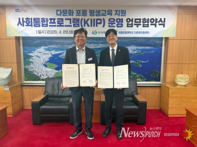 뉴스펀치 박세훈 기자 | 창원특례시는 시청 접견실에서 국립창원대학교와 외국인 주민의 안정적인 지역사회 정착 지원을 위한 '사회통합프로그램 운영' 업무협약을 체결했다고 밝혔다.