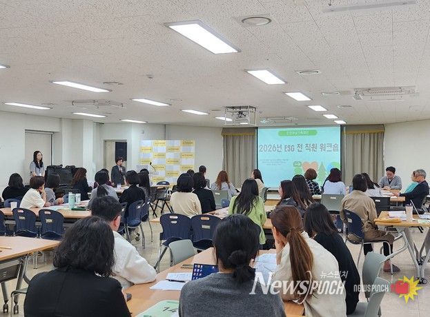 뉴스펀치 정홍균 기자 | 인천여성가족재단은 4월 28일 재단 소강당에서 전 직원을 대상으로 ‘2026년 ESG 전 직원 워크숍’을 열고, ESG 경영 내재화와 성과 중심 실행체계 구축 방안을 논의했다.