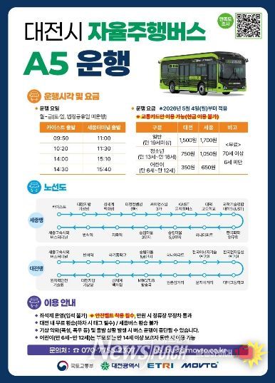 뉴스펀치 이현승 기자 | 대전시는 충청권 자율주행 시범운행지구에서 무료로 운영 중인 자율주행버스 A5 노선을 5월 4일부터 유상운송 서비스로 전환한다고 밝혔다.