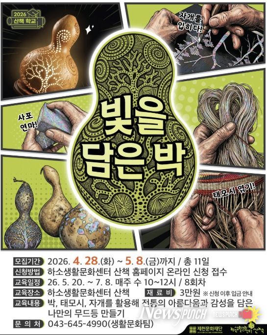 뉴스펀치 이현승 기자 | 제천문화재단이 운영하는 하소생활문화센터 산책에서 시민 참여형 문화예술교육 프로그램 ‘산책학교’의 ‘빛을 담은 박’ 수강생을 모집한다.