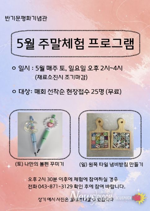 뉴스펀치 이현승 기자 | 음성군 반기문 평화기념관에서는 관람객을 위한 5월 주말 무료 체험 프로그램을 운영한다.