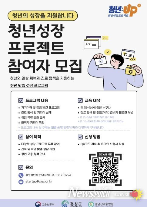 뉴스펀치 이현승 기자 | 홍성군이 청년 취업과 진로 지원을 강화한다. 군은 고용노동부 ‘청년성장프로젝트’ 공모사업에 2년 연속 선정되며 지역 청년을 위한 성장 지원 프로그램을 확대 운영한다고 밝혔다.