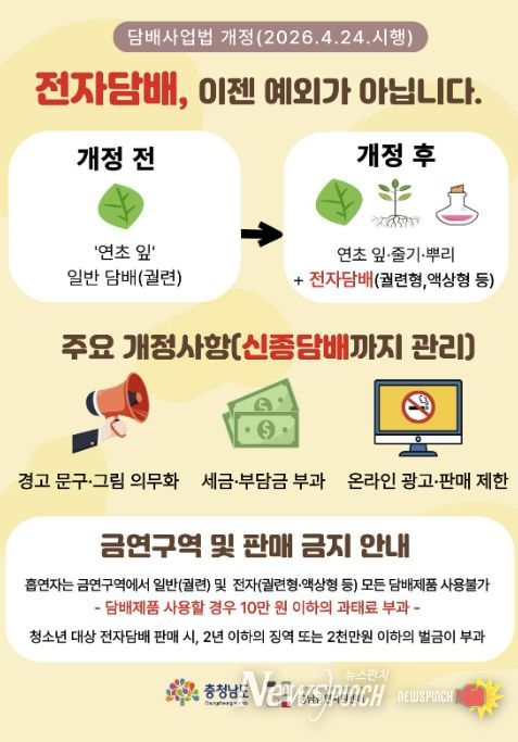 뉴스펀치 이현승 기자 | 4월 24일부터 '담배사업법' (이하 법) 개정 시행으로 액상형 전자담배를 포함한 모든 니코틴 제품이 ‘담배’로 규정된다. 그동안 규제 사각지대에 있던 합성니코틴 전자담배까지 관리 대상에 포함되면서 시민들의 혼란이 예상되는 가운데, 아산시는 금연환경 조성을 위한 대응에 나섰다.