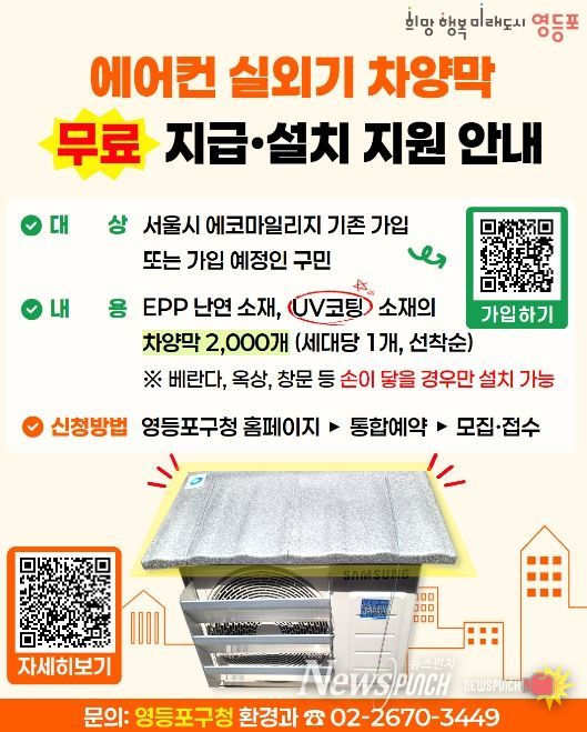 뉴스펀치 박상훈 기자 | 영등포구가 다가오는 여름철 무더위에 대비해 구민들의 냉방비 부담을 줄이고 에너지 효율을 높이기 위한 ‘에어컨 실외기 차양막 설치 지원사업’을 추진한다고 밝혔다.