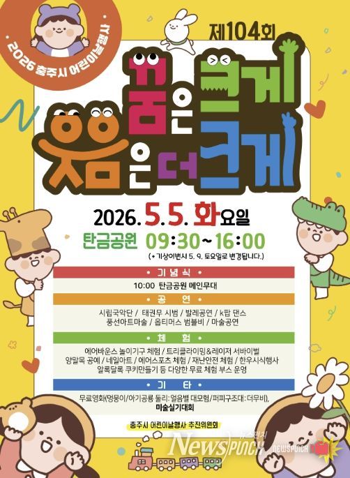 뉴스펀치 이현승 기자 | 충주시는 오는 5월 5일 오전 9시 30분부터 탄금공원에서 ‘제104회 어린이날’을 기념하는 ‘2026 어린이날 행사’를 개최한다고 밝혔다.