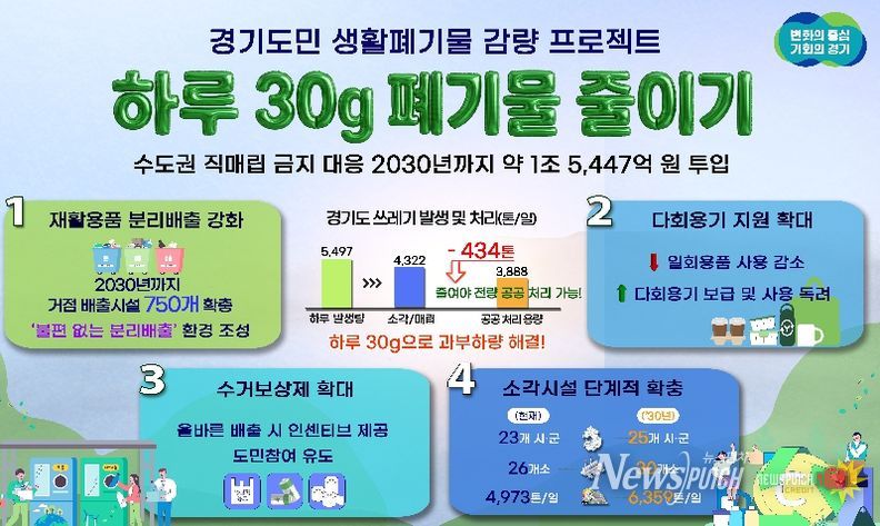 뉴스펀치 박상훈 기자 | 수도권 직매립 금지에 따른 생활쓰레기 감량을 위해 경기도가 2030년까지 5년간 약 1조 5,447억 원을 투입하는 ‘하루 30g, 도민실천형 생활폐기물 감량 프로젝트’를 추진한다.