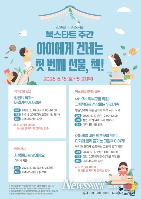 뉴스펀치 조평훈 기자 | 원주시 미리내도서관은 다음 달 16일부터 21일까지 북스타트코리아와 함께 ‘아이에게 건네는 첫 번째 선물, 책!’을 주제로 북스타트 주간 프로그램을 운영한다.