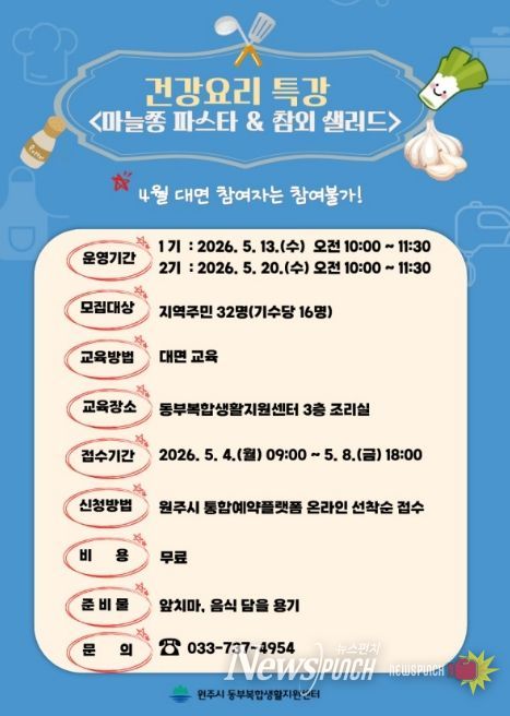 뉴스펀치 조평훈 기자 | 원주시 동부복합생활지원센터는 다음 달 4일부터 ‘마늘쫑 파스타·참외 샐러드 만들기’ 건강 요리 특강 프로그램 참여자를 모집한다.