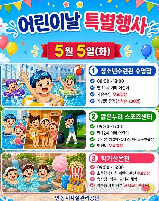 뉴스펀치 박세훈 기자 | 안동시시설관리공단은 제104회 어린이날을 맞아, 오는 5월 5일 공단이 운영하는 주요 공공시설 3곳을 어린이와 가족들을 위해 무료로 개방하고 다채로운 체험행사를 운영한다고 밝혔다.