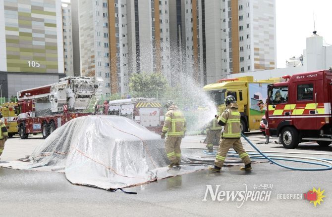 뉴스펀치 이현승 기자 | 서산소방서는 최근 전기차 보급 증가에 따라 아파트 지하주차장에서 발생할 수 있는 화재에 대비하기 위해 ‘질식소화덮개’비치 확대를 권장한다고 밝혔다.