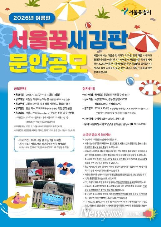 뉴스펀치 박상훈 기자 | 서울시가 ‘여름의 더위를 잊게 해줄 시원하고 청량한 글귀’를 주제로 '2026년 여름편 서울꿈새김판 문안 공모전'을 4월 29일부터 5월 11일까지 13일간 진행한다.