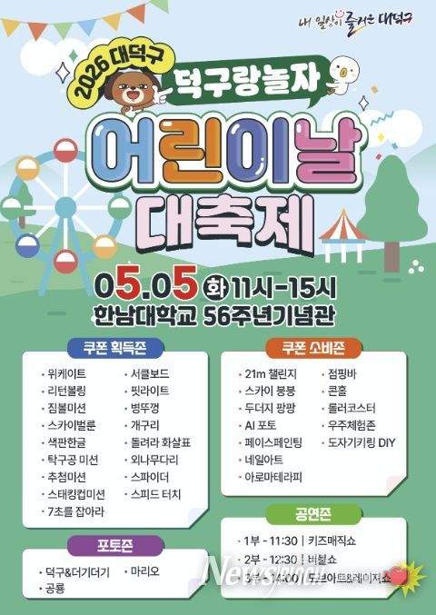뉴스펀치 이현승 기자 | 대전 대덕구는 제104회 어린이날을 맞아 아동과 가족이 함께 즐길 수 있는 ‘덕구랑 놀자! 대덕구 어린이날 대축제’를 개최한다고 밝혔다.