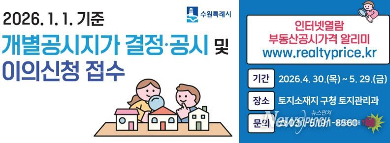 뉴스펀치 박상훈 기자 | 수원시 영통구는 2026년 1월 1일 기준 개별공시지가를 4월 30일 결정·공시하고, 5월 29일까지 이의신청 기간을 운영한다.