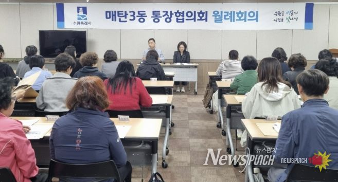 뉴스펀치 박상훈 기자 | 수원시 영통구 매탄3동은 지난 28일 시정 및 동정 소식 공유를 위해 4월 2차 통장협의회 월례회의를 개최했다.