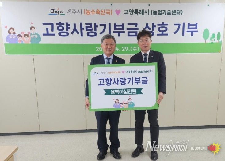 뉴스펀치 김용희 기자 | 제주시는 4월 29일 고양특례시 농업기술센터에서 고양특례시와 고향사랑기부금 상호 전달식을 갖고 지역 간 상생과 협력 강화에 뜻을 모았다.